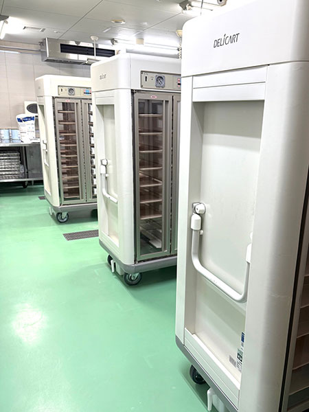 理学療法士等が見守るなか、適切な指導を受けて行えるので、安心して無理なく楽しく運動機能の改善を図れます。また、ゆったりとした談話スペース、明るい食堂、広いレクリエーションスペースなどのほか、豊富な献立に基づき、いつでもあたたかい物はあたたかく、冷たいものは冷たいまま、美味しく召し上がっていただけるよう、温冷配膳車を配置しています。